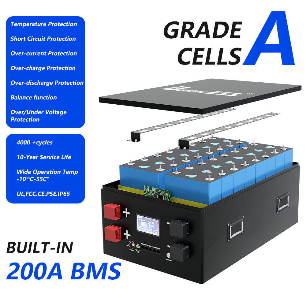 | Package Contents | Case, BMS, Display screen, Switch, Copper busbars, Collection wires, Communication board, Active balancer, Epoxy resin board, Connection strips, Positive & negative terminals, Screws, and other accessories |