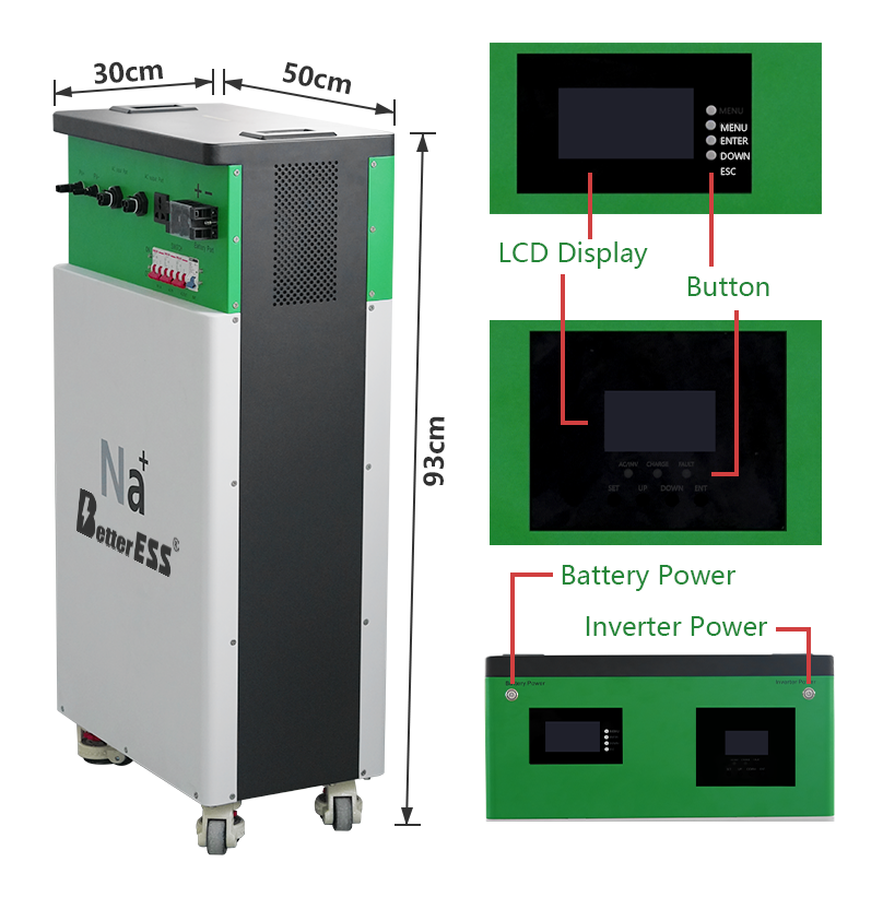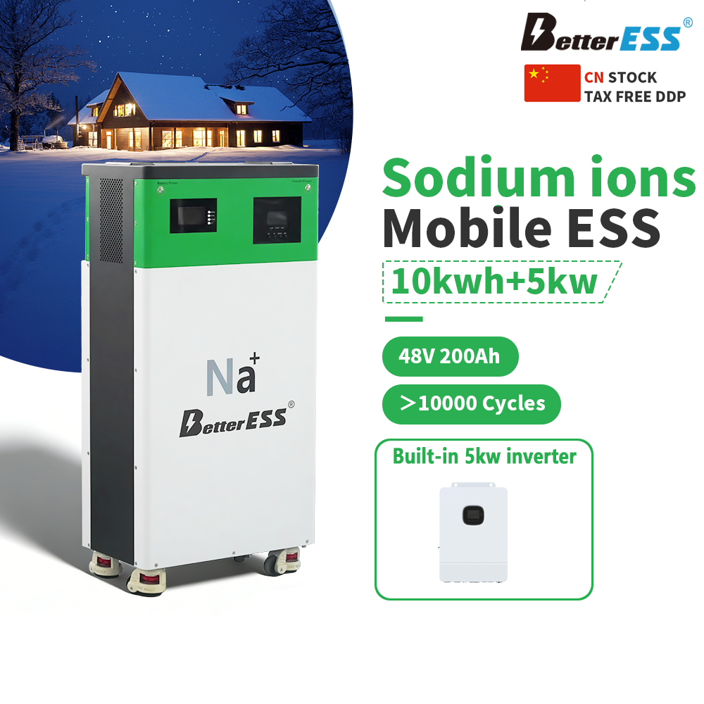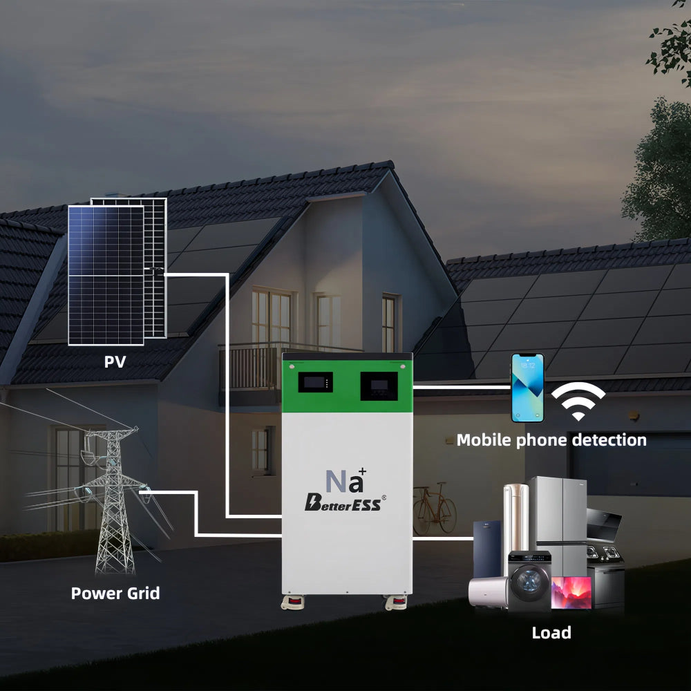 This all-in-one home energy storage system integrates a 9.6kWh Sodium-ion battery and a 5.5kW hybrid inverter, designed for solar energy storage, home backup power, and off-grid applications. It is compact, easy to install, and ideal for residential solar systems.