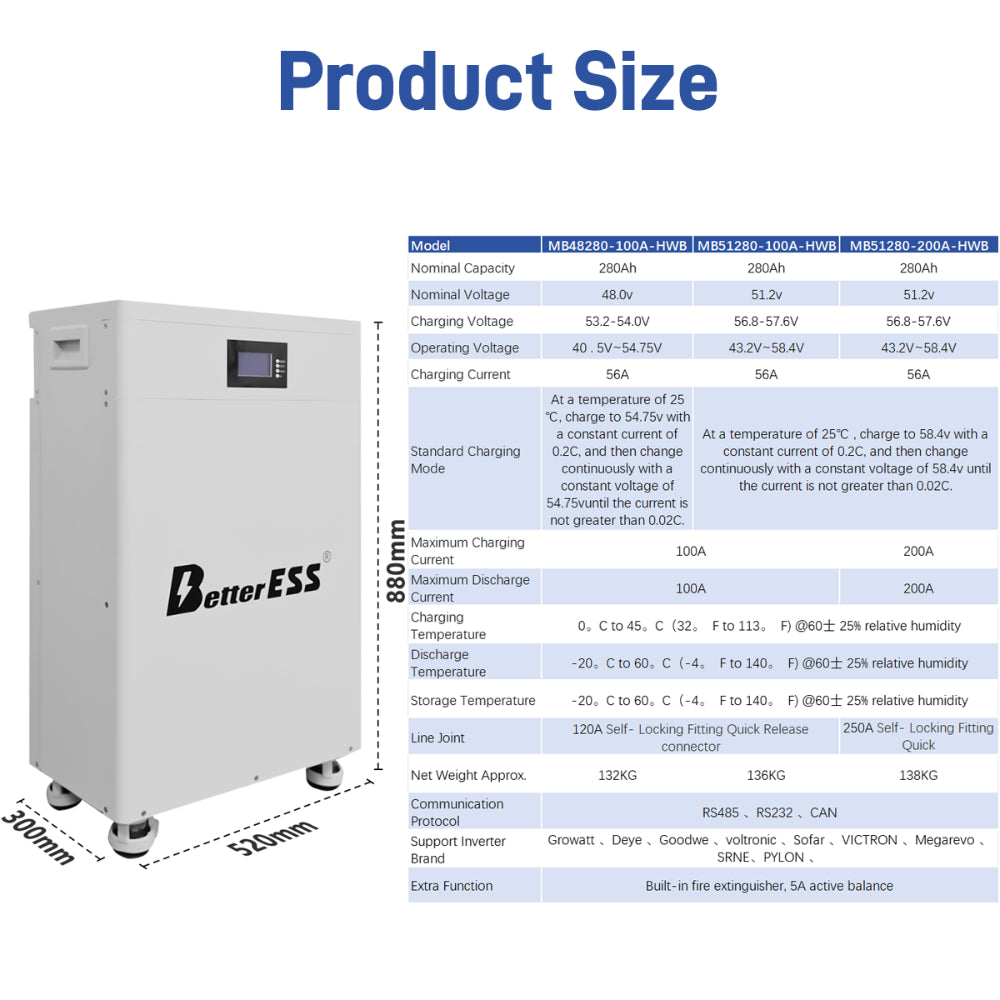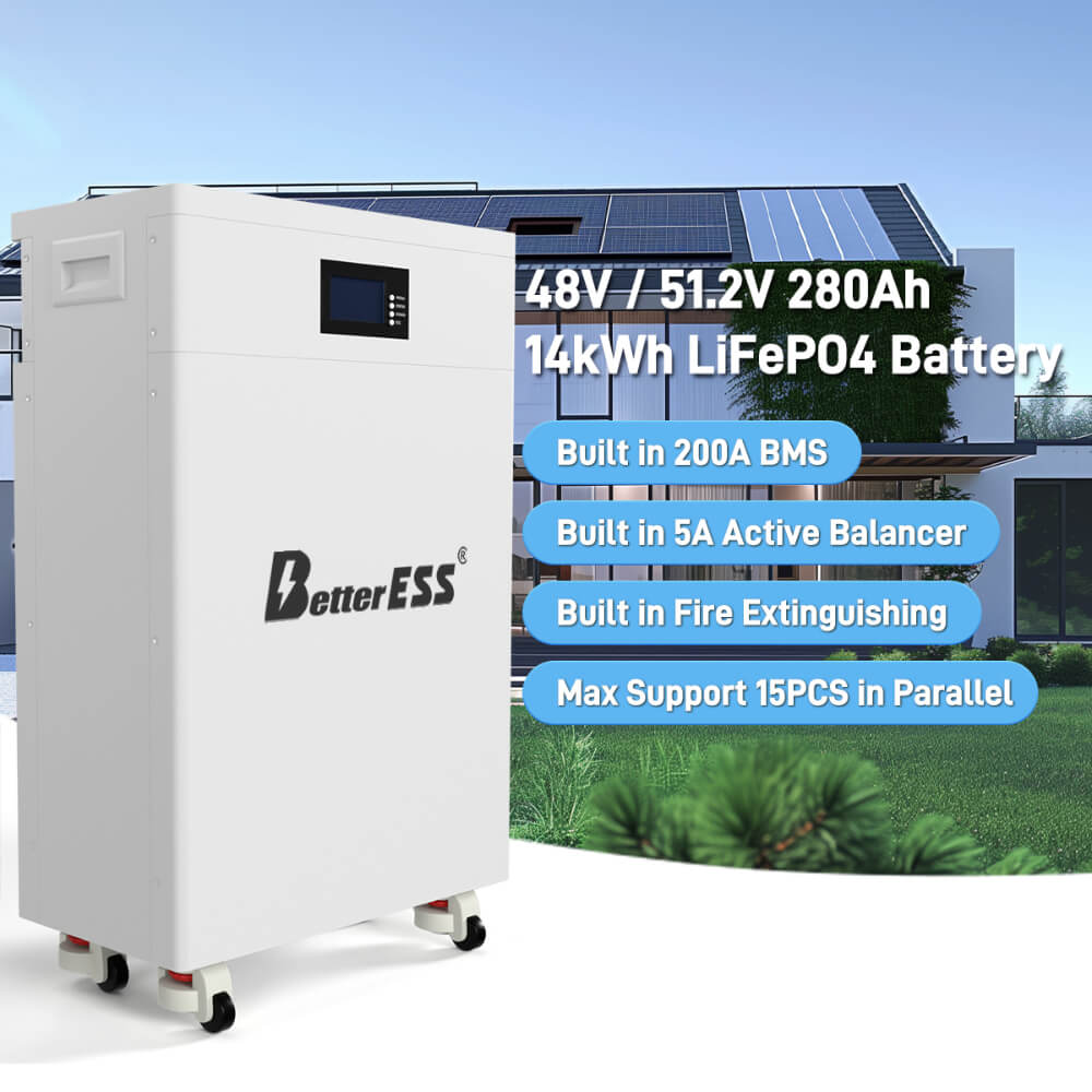 BetterESS 14KWh lifepo4 battery supports parallel connection to expand capacity, which is equipped with 14 lithium 280AH batteries.