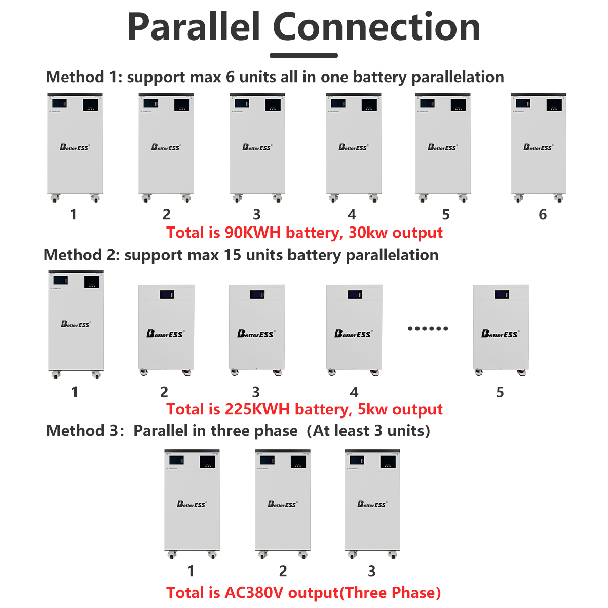BetterESS 15Kwh All-in-one battery built-in 5KW inverter, it can connect all in one battery of the same model to form three phases system or just to expand capacity; It can also connect 15KWH battery (without inverter) to expand capacity,but the battery model must be the same.