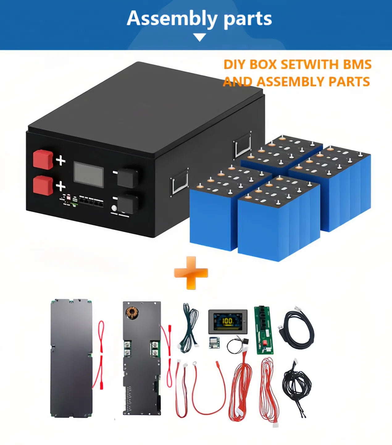 | Package Contents | Case, BMS, Display screen, Switch, Copper busbars, Collection wires, Communication board, Active balancer, Epoxy resin board, Connection strips, Positive & negative terminals, Screws, and other accessories |