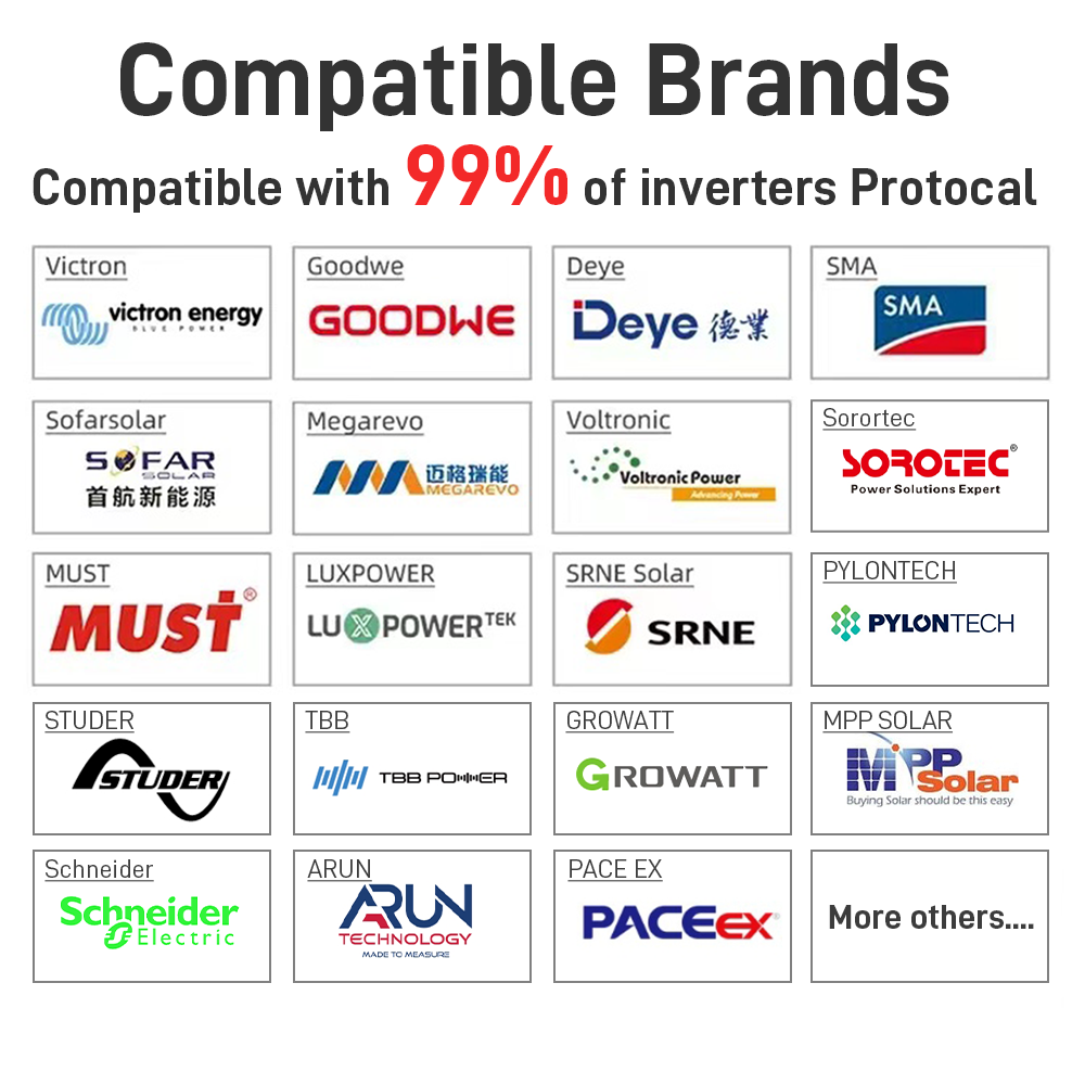 | Support Inverter Brand | Growatt, Deye, Goodwe, Voltronic, Sofar, VICTRON, Megarevo, SRNE, PYLON, Luxpowertek, Sorotec, SMA, GINLONG, MUST, TBB, STUDER | |||