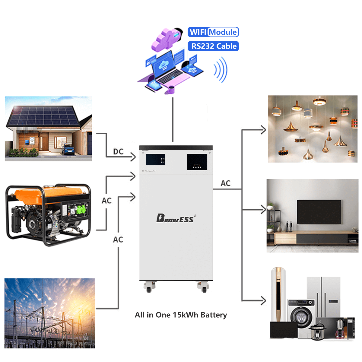 BetterESS 16Kwh All-in-one battery built-in 5KW inverter, it can connect all in one battery of the same model to form three phases system or just to expand capacity; It can also connect 16KWH battery (without inverter) to expand capacity,but the battery model must be the same.