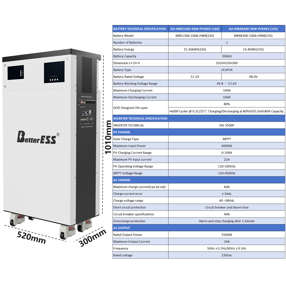 BetterESS 48V 51.2V 314Ah 16kWh All-in-one battery built-in 5KW inverter with active balancer module and lifepo4 temperature-sensitive fire extinguisher; Battery and inverter integrated into one, easy to install, plug and play.